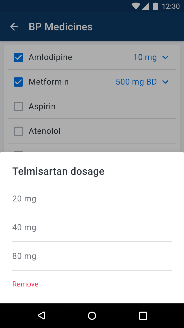 Protocol medications and other common BP medication are pre-loaded by default. These are custom per region. Users can optionally enter any other medication by typing out the name.