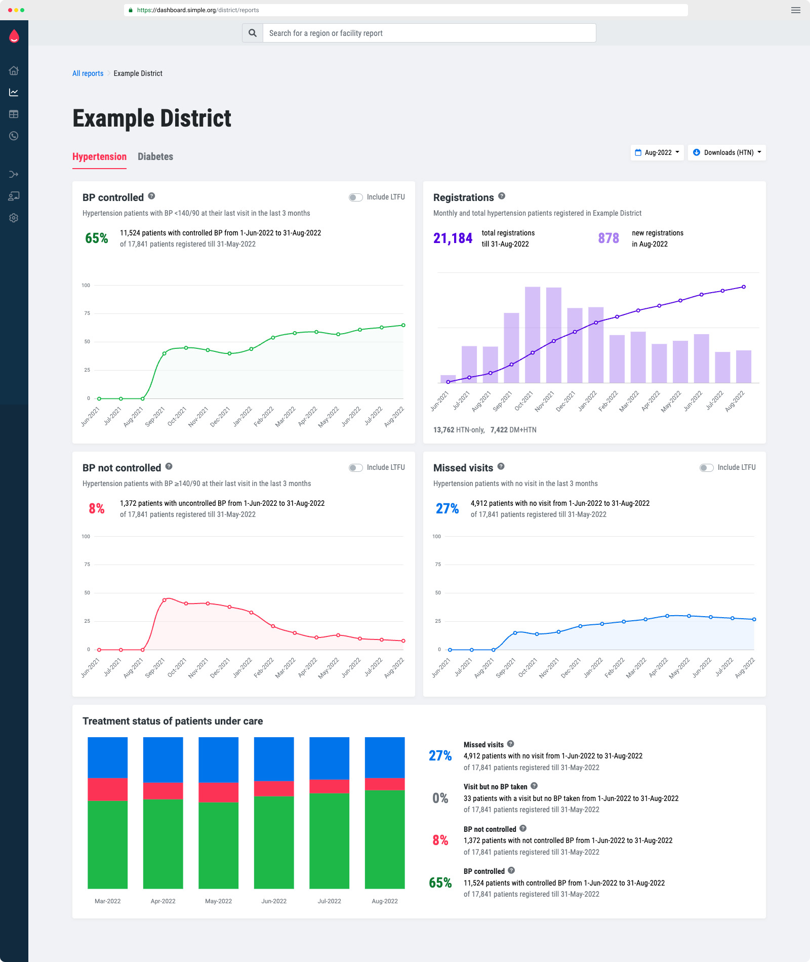 Oversee hypertension control rates, registrations, missed visits, population coverage, lost-to-follow-up rates and compare facility performance.